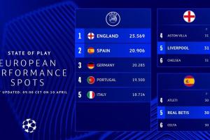 欧足联官方:英超下赛季锁定5个欧冠名额 西甲暂第二德甲葡超三四